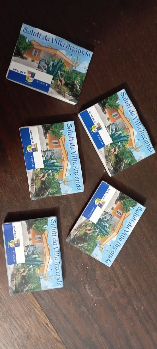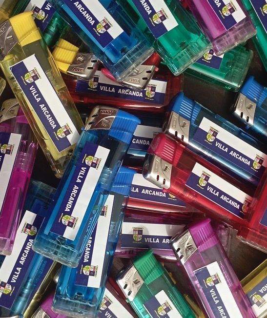 Accendini con scritta "villa Arcanda" e stemma su sfondo bianco blu